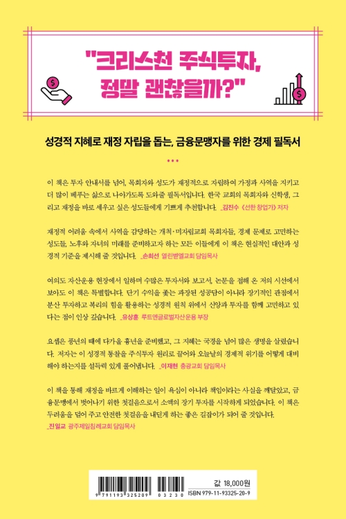 여의도 자산운용 현장에서 일하며 수많은 투자서와 보고서, 논문을 접해 온 저의 시선에서 보아도 이 책은 특별합니다. 평범한 지역 교회 목회자가 쓴 투자 안내서임에도, 투자에 대한 방향과 태도가 매우 절제되고 책임감 있게 정리되어 있습니다. 여전히 한국 교회 안에서는 재정과 투자에 대한 성경적 가르침이 충분히 다뤄지지 않고 있습니다. 이 책을 통해 더 많은 분들이 청지기적 재정관과 성경적인 투자를 배우고 경험함으로써 금융과 투자라는 영역 안에서도 하나님의 통치를 경험할 수 있기를 간절히 기도합니다.
