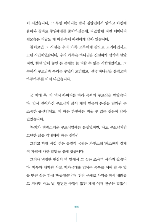 제가 주식투자에 관심을 두게 된 이유는 그저 돈을 더 벌고 싶어서가 아닙니다. 앞으로 자세히 다루겠지만 비록 적은 금액이라도 하나님이 맡겨 주신 자원을 지혜롭게 관리하고, 미래를 준비하며, 나눔을 통해 하나님 나라를 세워 가는 대안을 찾고 싶은 것입니다. 그렇기에 이 책은 단순히 투자 기술을 전수하려고 쓴 것이 아닙니다. 오히려 믿음과 돈을 어떻게 연결할 수 있을지에 대한 탐구와 실천의 기록입니다. 돈이라는 민감한 주제를 신앙의 빛으로 바라보며, 재정을 관리하는 일이 곧 영적 훈련의 연장선이라는 사실을 고백하는 이야기이기도 합니다. 결국 제가 이 무겁고 예민한 주제를 책으로 펴낸 이유는 하나입니다. 바로 “하나님을 신뢰하는 삶 안에서 경제적으로 지혜롭게 살아갈 수 있다”는 사실을 여러분과 나누고 싶어서입니다. 물론 하나님을 신뢰한다면 삶의 모든 영역에서 지혜롭게 살아가는 것이 마땅합니다. 그러나 현실에서는 신앙과 경제를 서로 다른 영역으로 분리해 이해하는 경우가 적지 않습니다. 이 책은 그 간극을 다시 잇고자 하는 작은 시도입니다. 부족하지만 이 책이 마중물이 되어 독자 한 분 한 분이 삶 속에서 구체적인 변화를 시작하고 믿음과 재정을 함께 세워 가는 용기와 통찰을 얻게 되길 소망합니다.