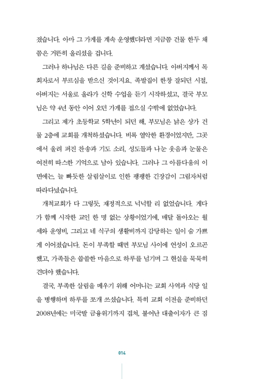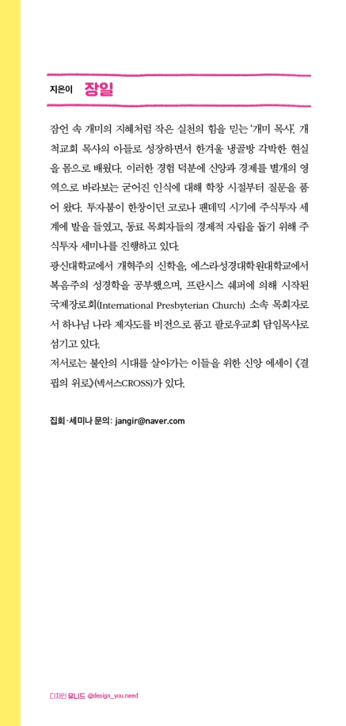 개척교회 목회자의 아들로서 가난을 몸소 겪으며 자라온 저자는 오랫동안 ‘돈과 신앙은 양립할 수 없을까’ 하는 질문을 던져 왔다. 그러던 중 코로나 팬데믹 시기를 거치면서 주식투자에 관심을 갖게 되었고, 실제 투자 경험을 통해 목회자의 경제적 자립이라는 현실적인 과제를 다시 생각하게 되었다. 저자는 요셉이 풍년의 때에 흉년을 대비했듯, 현장에서 사역하고 있는 지금이야말로 ‘풍년의 때’임을 강조하며 근검절약과 책임 있는 투자를 통해 가정의 재정을 든든히 하고 교회와 이웃을 위해 더 많이 나눌 수 있는 길을 제시한다.