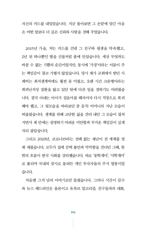책에도 썼지만, 제가 투자에 입문하게 된 계기는 어려운 개척교회 목사 아들로 자라며 최소한의 경제적 자립을 어떻게 준비할 수 있을지 고민해 온 오랜 질문에서 비롯되었습니다. 그러던 중 코로나 팬데믹 시기에 전 국민적인 투자 열풍이 일었고, 그 흐름 속에서 자연스럽게 투자를 시작하게 되었습니다.