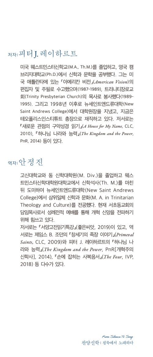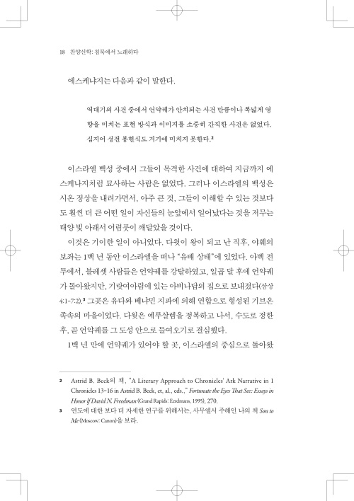 이 책은 모세의 성막, 다윗의 장막, 솔로몬 성전의 제사(예배)에 대한 의미가 어떻게 발전하였는지를 다룬다. 이스라엘 역사 가운데 다윗의 장막 혹은 성전에서 이루어진 찬양 예배는 아주 기념비적인 역사의 흐름을 갖는다. 특히, 이스라엘은 항상 야훼를 예배하며 섬기도록 열방을 이끄는 도구임을 강조한다. 찬양에 참여할 때, 그들은 자신의 우상을 훼파하였다. 저자는 구원으로 이끄는 찬양의 필요성에 성경 역사적 관점에서 잘 해석했다. 찬양에 대한 성경 역사적 배경에 관심을 갖는 독자들에게 이 책을 적극 추천한다.