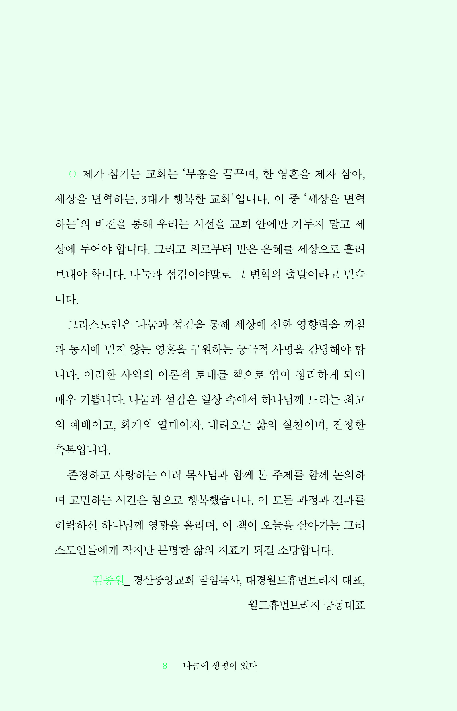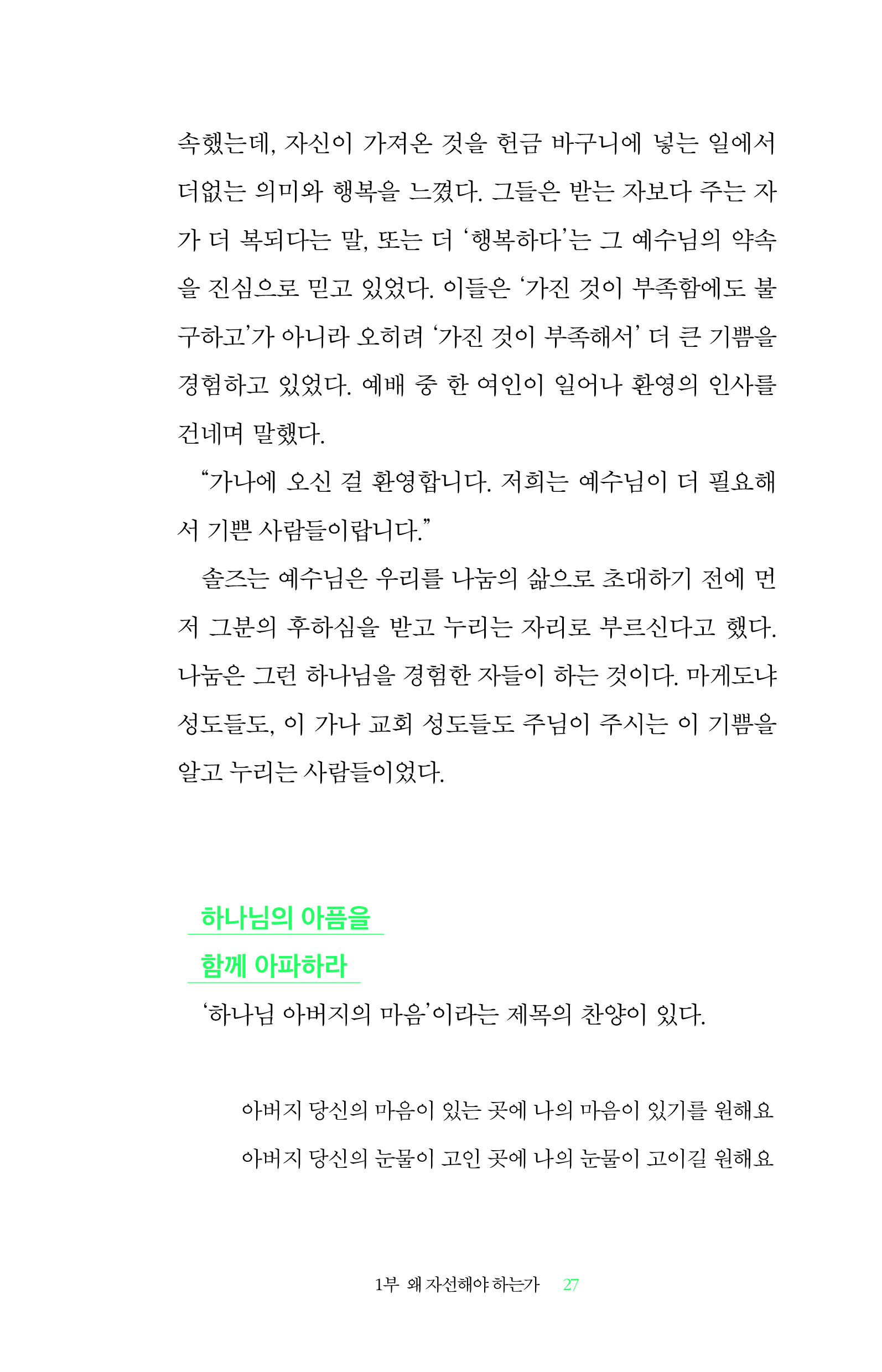 나눔은 단순히 행동에만 국한되는 것이 아니다. 마음과 생각도 중요하다. 왜냐하면 이 선한 일이야말로 하나님의 마음에 합해야 하는 것이기 때문이다. 그래서 우리는 성경 말씀을 배우는 것만큼 섬김의 교육을 받아야 한다. 섬김, 곧 자선은 우리의 마음이 실제적인 태도로 드러날 수 있는 통로다.