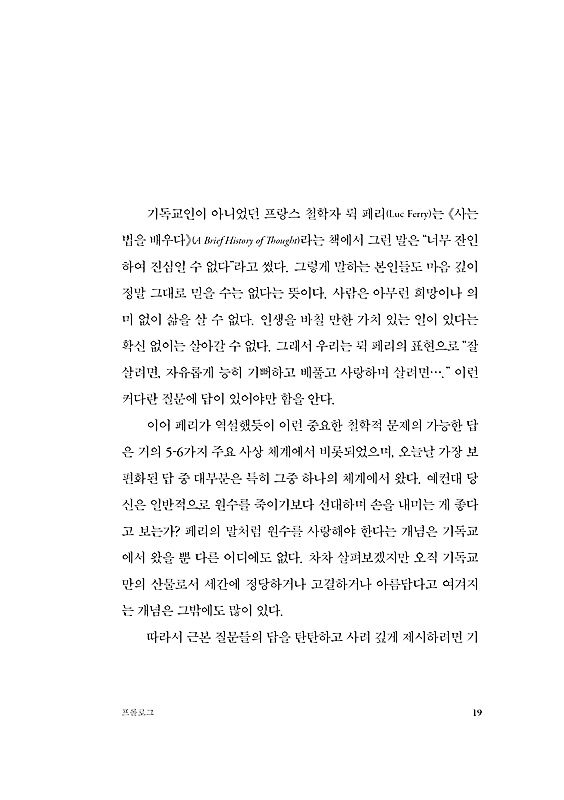 기독교인이 아니었던 프랑스 철학자 뤽 페리(Luc Ferry)는 《사는 법을 배우다》(A Brief History of Thought)라는 책에서