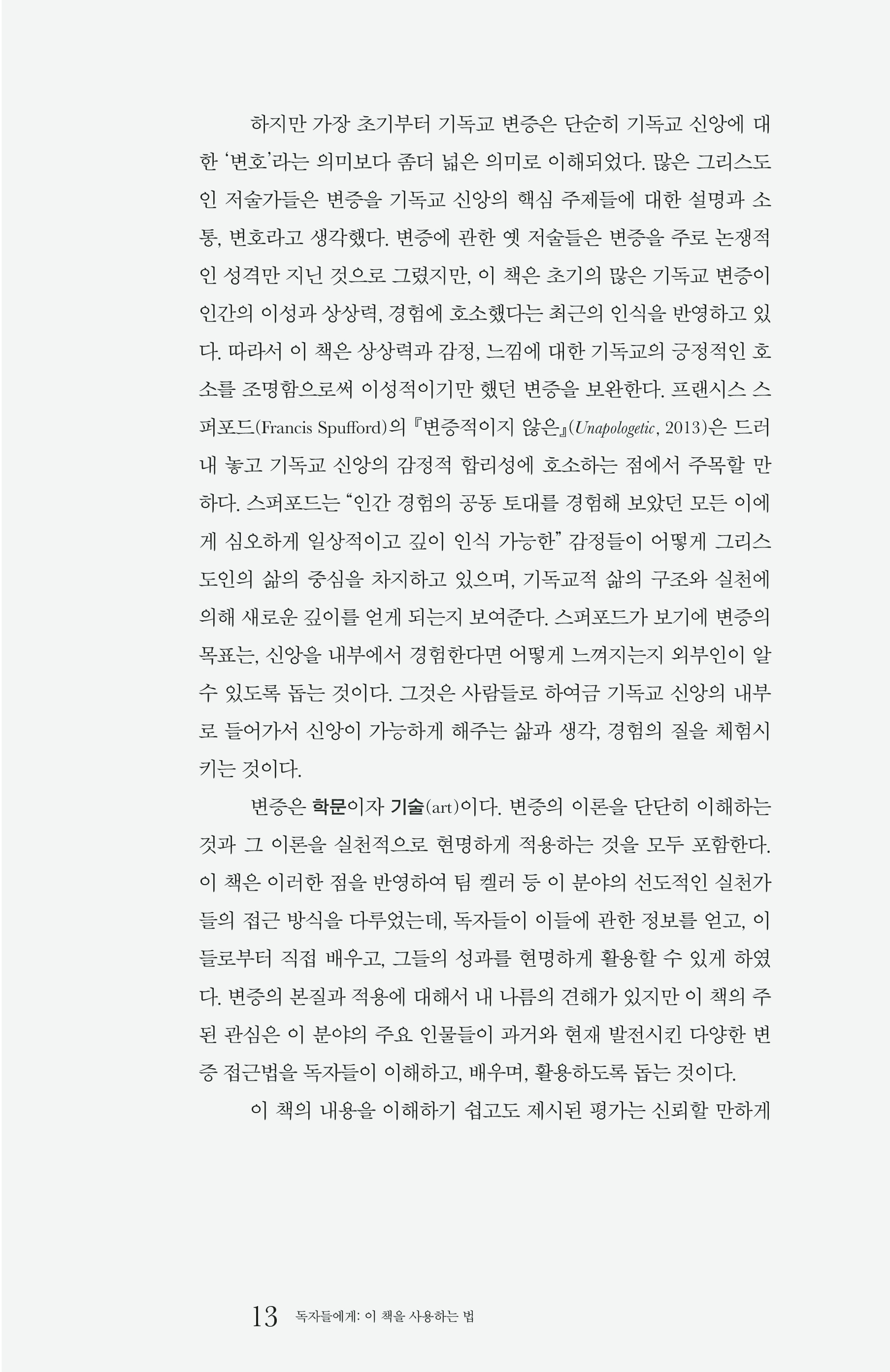 학부생 시절, 저자의 첫 강의에 나는 매료되었다. 어렵고 복잡한 문제를 명쾌하고도 지혜롭게 풀어내는 그의 독특한 능력은 타의 추종을 불허한다. 저자 특유의 명민함과 명석함으로 변증에 대한 포괄적인 접근법을 제시하는 이 책은 또 한 번 저자의 대표작이 될 것이라 믿는다.