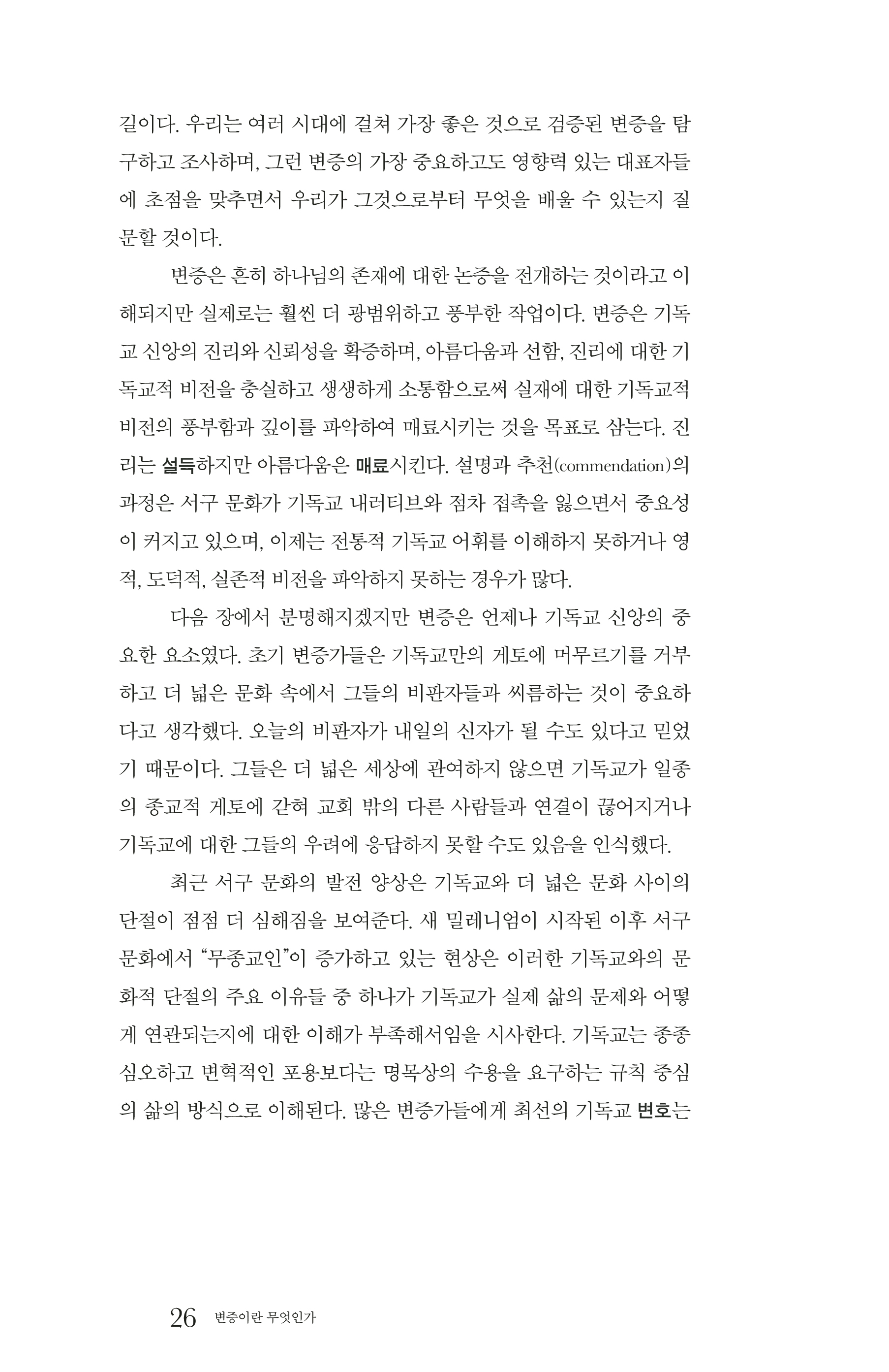 한 세대 앞만 놓고 보더라도 기독교 신앙 변증이 크게 요청되지 않았다. 신앙의 합리성에 관한 물음은 거의 제기되지 않았다. 이제 그런 시대는 지나갔다. 신앙의 근거와 이유, 신앙의 타당성은 젊은이들 가운데 끊임없이 제기된다. 교회와 신학대학원, 부모와 선생님은 제기되는 질문을 함께 생각하고, 함께 답할 준비를 해야 한다. 그러기 위해서는 질문을 알아야 하고 생각하는 법을 배워야 한다. 맥그래스의 책은 그렇게 하는 데 필요한 지도를 어느 책보다 믿을 만하게 제공해 준다. 지난 7년간 신학대학원에서 기독교 변증과 철학을 가르쳐 본 경험을 따라 볼 때 이 책은 설교자나 교사, 신앙의 문제에 관심 있는 모든 신자들이 믿고 공부할 수 있는 최선의 변증학 교과서로 진심으로 추천한다.