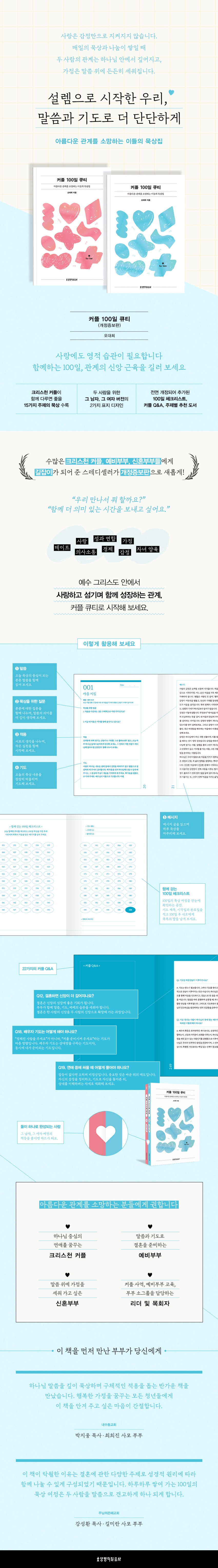 2002년 첫 출간 이후, 수많은 크리스천 커플, 예비부부, 그리고 신혼부부들에게 하나님 안에서의 아름다운 관계를 누릴 수 있도록 길잡이가 되어 준 스테디셀러 『커플을 위한 100일 큐티』가 개정증보판으로 새롭게 출간되었습니다. 특별히 그 남자, 그 여자 버전의 2가지 표지 디자인을 선보이는 이번 개정증보판은 전면 개정된 내용과, 함께 걷는 100일 체크리스트, 커플 Q&A, 주제별 참고 도서 등을 수록해 함께하는 재미를 더할 것입니다.