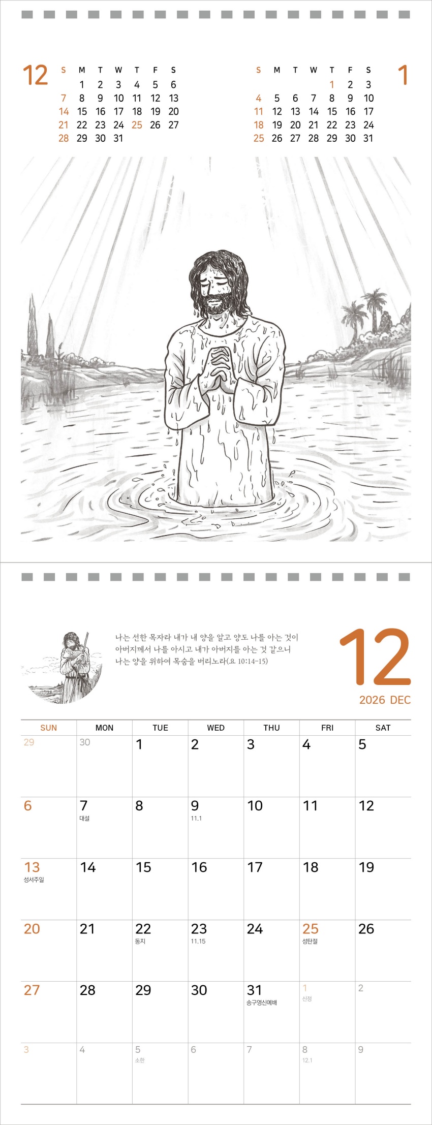 이번 달력은 복음서 속 예수님의 삶을 중심으로, ‘주님과 함께 걷는 시간’이라는 주제를 따뜻한 흑백 삽화로 담아냈다.