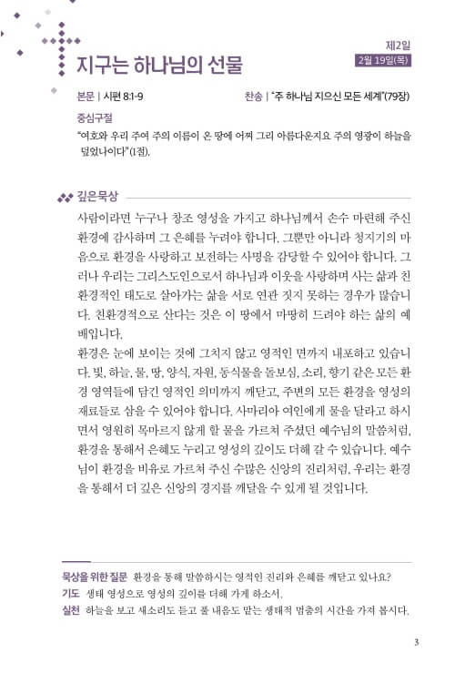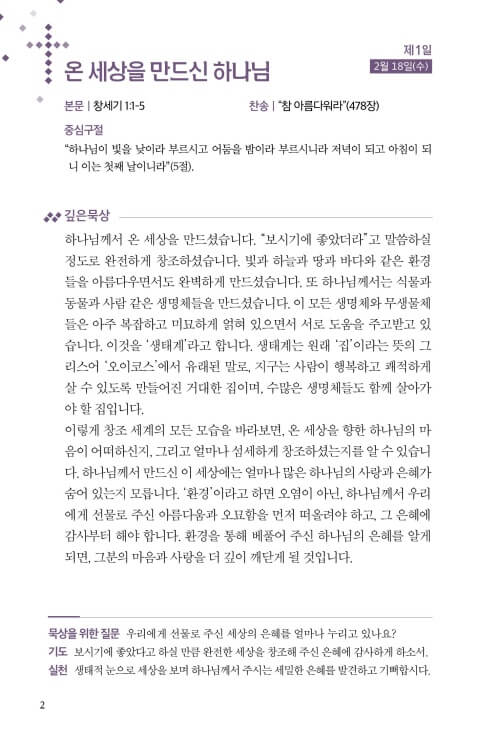 이번 사순절의 깊은 묵상 : 사순절, 창조를 회복하는 십자가의 길은 개인적인 경건 훈련을 넘어 인간의 탐욕과 죄로 신음하고 있는 창조 세계 앞에서 회개하는 시간으로 삼고, 절제와 나눔으로 예수님을 닮아가며, 하나님과 생태 이웃을 비롯한 모든 피조세계와의 화목을 회복하는 청지기적인 순례의 여정이 되도록 기획했습니다.