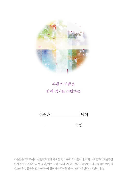 재의 수요일부터 고난주간까지 주일을 제외한 40일동안, 예수 그리스도의 고난과 부활을 묵상하고 자신을 돌아보며, 영광스러운 부활절을 맞이하기까지 참회하며 주님을 닮아 가고자 훈련하는 시간입니다.