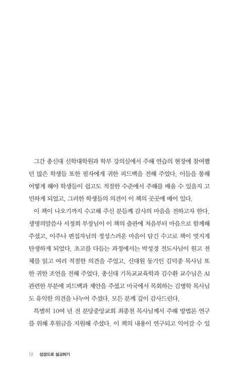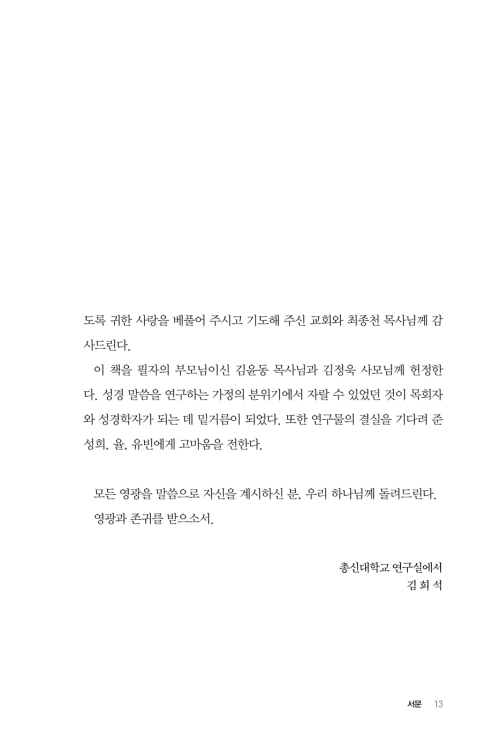 또한 설교자는 아니지만 성경을 잘 읽고 이해하기를 원하는 수많은 그리스도인에게도 이 책은 친절한 길을 제시한다. 모든 독자가 원어를 다루지 않더라도 역사적 배경과 단어 연구, 문예적 흐름, 정경적 이해 등의 기초 개념과 방법을 따라 읽어 나가다 보면, 무엇을 살피고 어떤 질문을 던져야 하는지에 대한 그림이 점차 분명해진다. 성경을 ‘사랑하는 책’에 머물게 하지 않고, ‘이해하는 책’으로 읽게 돕는다는 점에서 이 책의 의의는 분명하다.