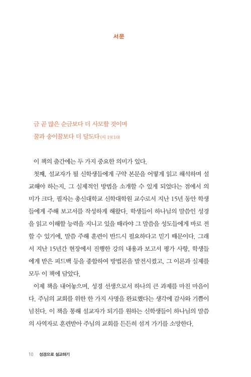 단순한 학술 연구를 넘어, 목회 준비 훈련을 위한 실천적 책이다. 설교를 위해 성경을 어떻게 읽고 이해하고 메시지화 해야 하는지, 막연한 원칙이 아니라 구체적인 길로 조목조목 설명한다. 목회자와 신학생들은 이 책을 ‘꼭꼭 씹어 먹듯이’ 숙독하여, 말씀의 사람으로 준비되도록 스스로를 단련해야 할 것이다.